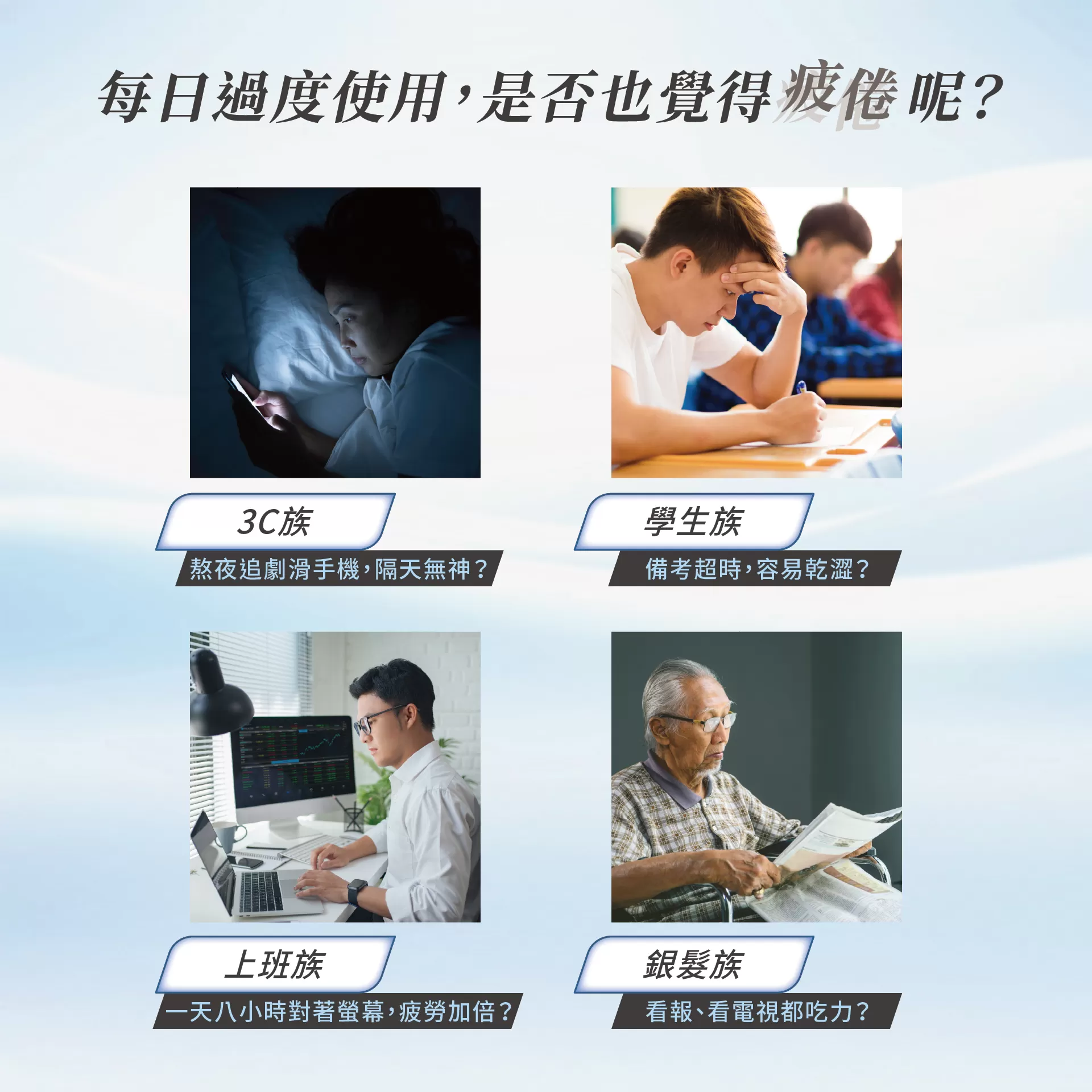 適合電腦族、手機族、長時間課業學習的學生族群,以及學齡孩童的日常營養補充。