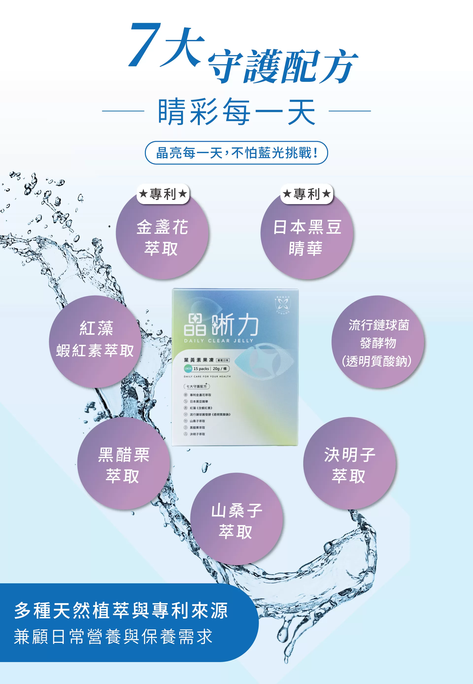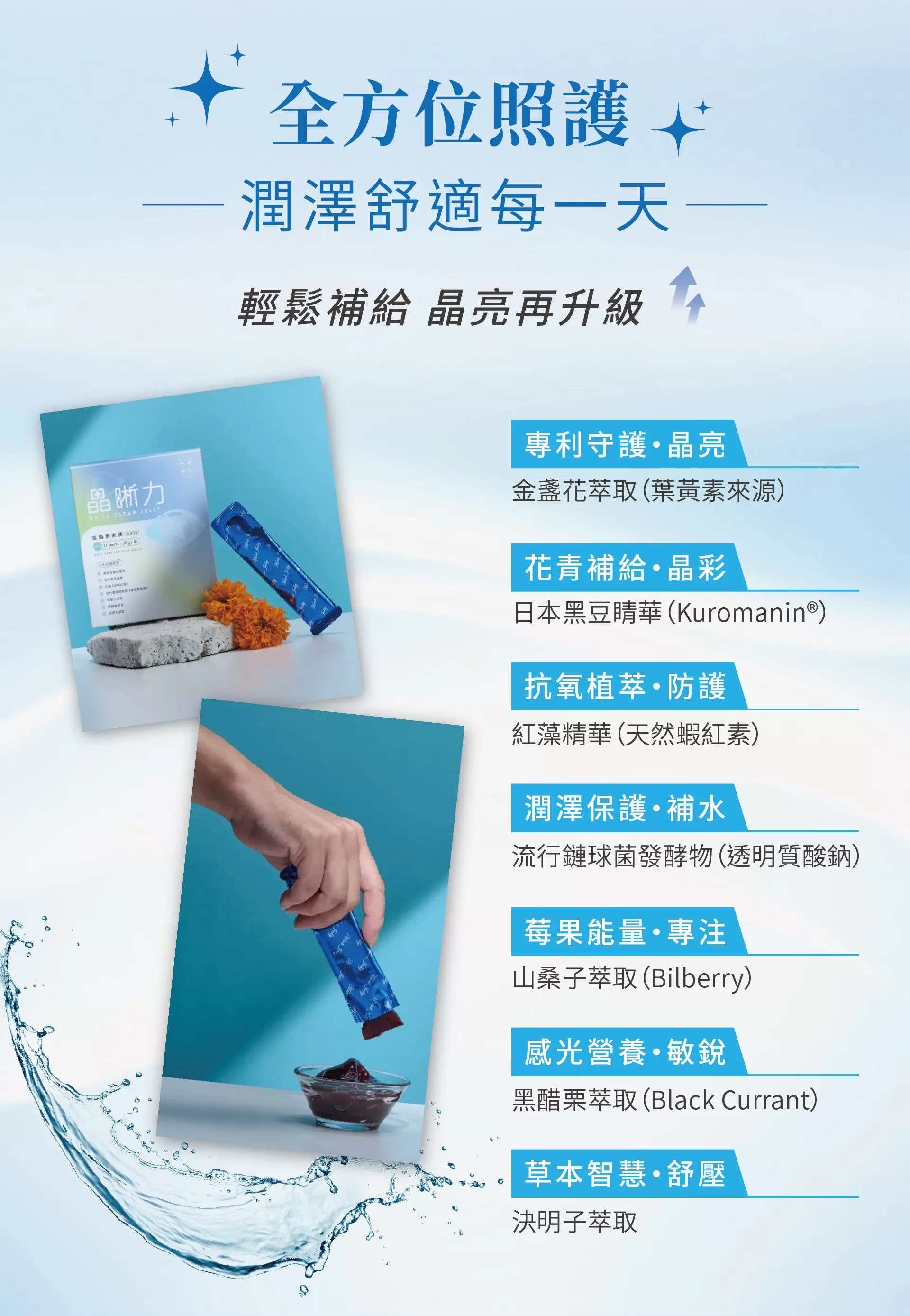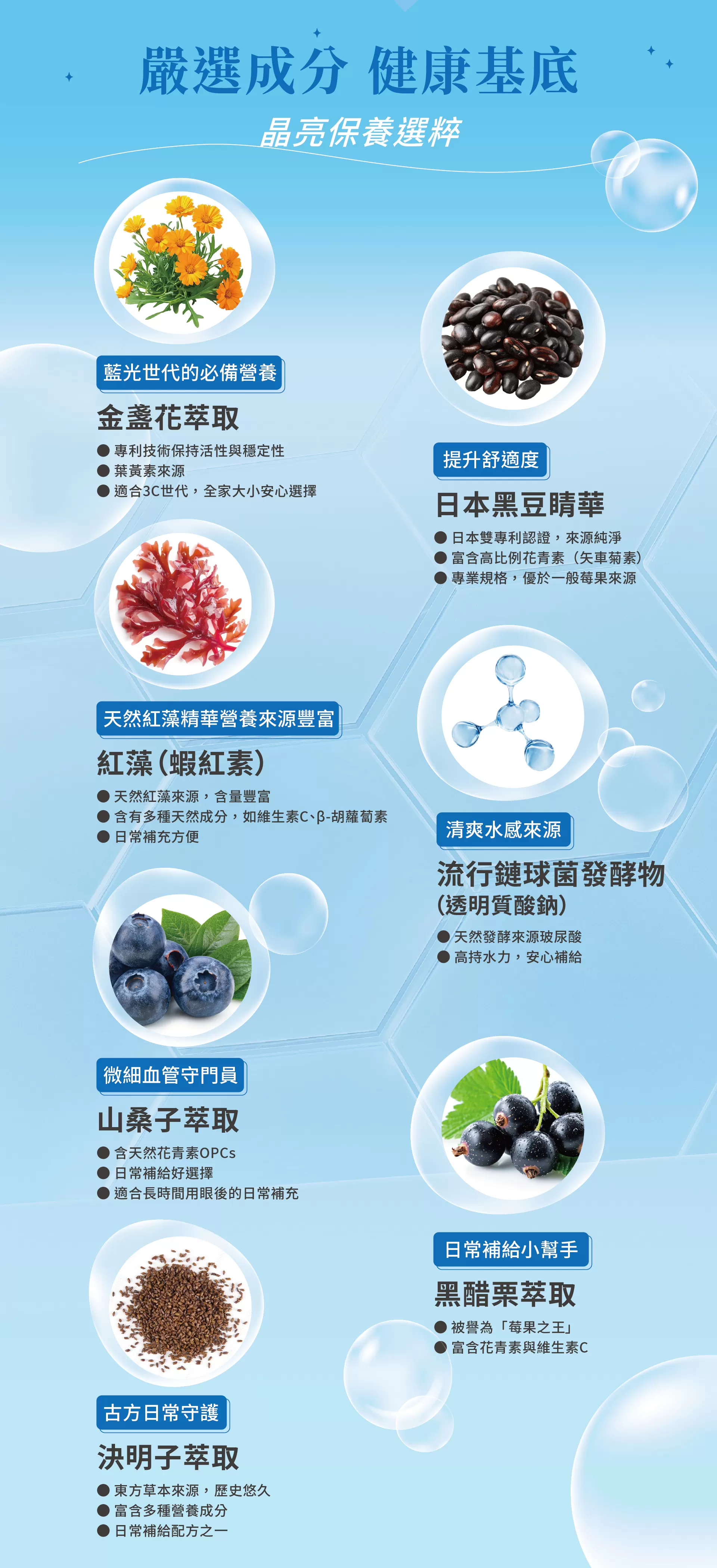 日本黑豆睛華、山桑子與黑醋栗萃取,含天然花青素,為日常飲食提供更多元選擇。