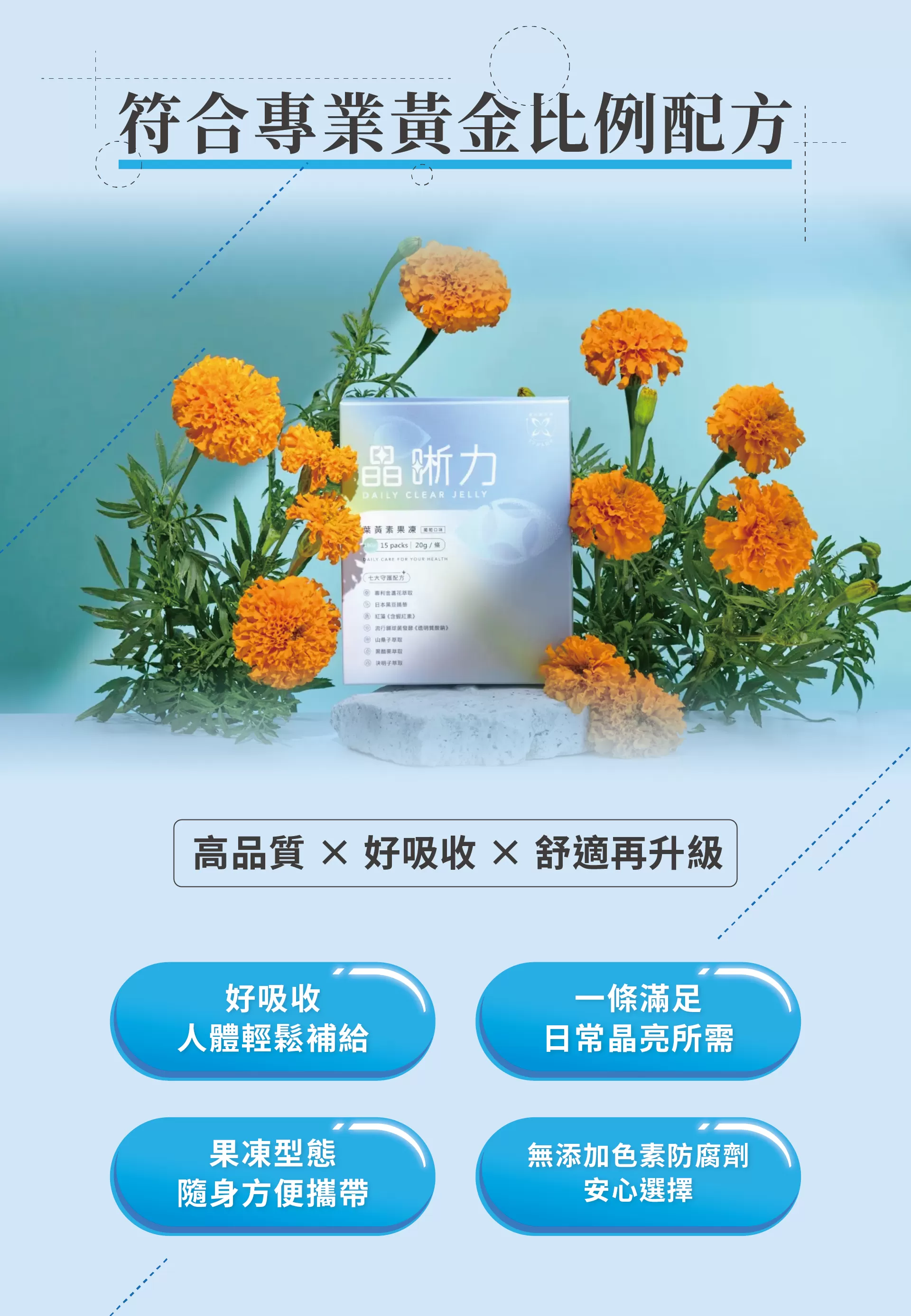 專利金盞花萃取含葉黃素,適合長時間使用螢幕時的日常營養補充。
