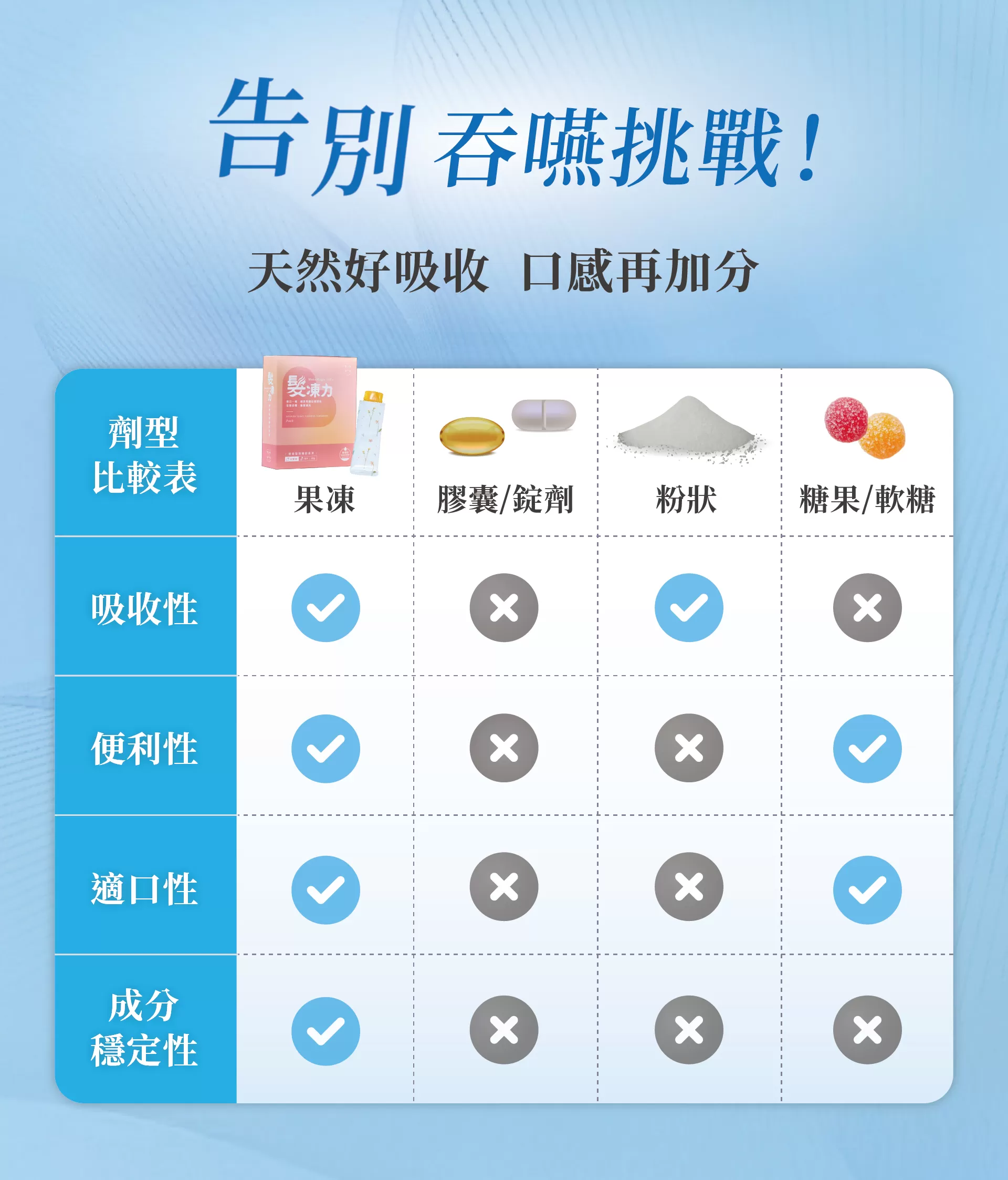 果凍條型態,結合七大植萃成分,讓日常營養補給更便利。