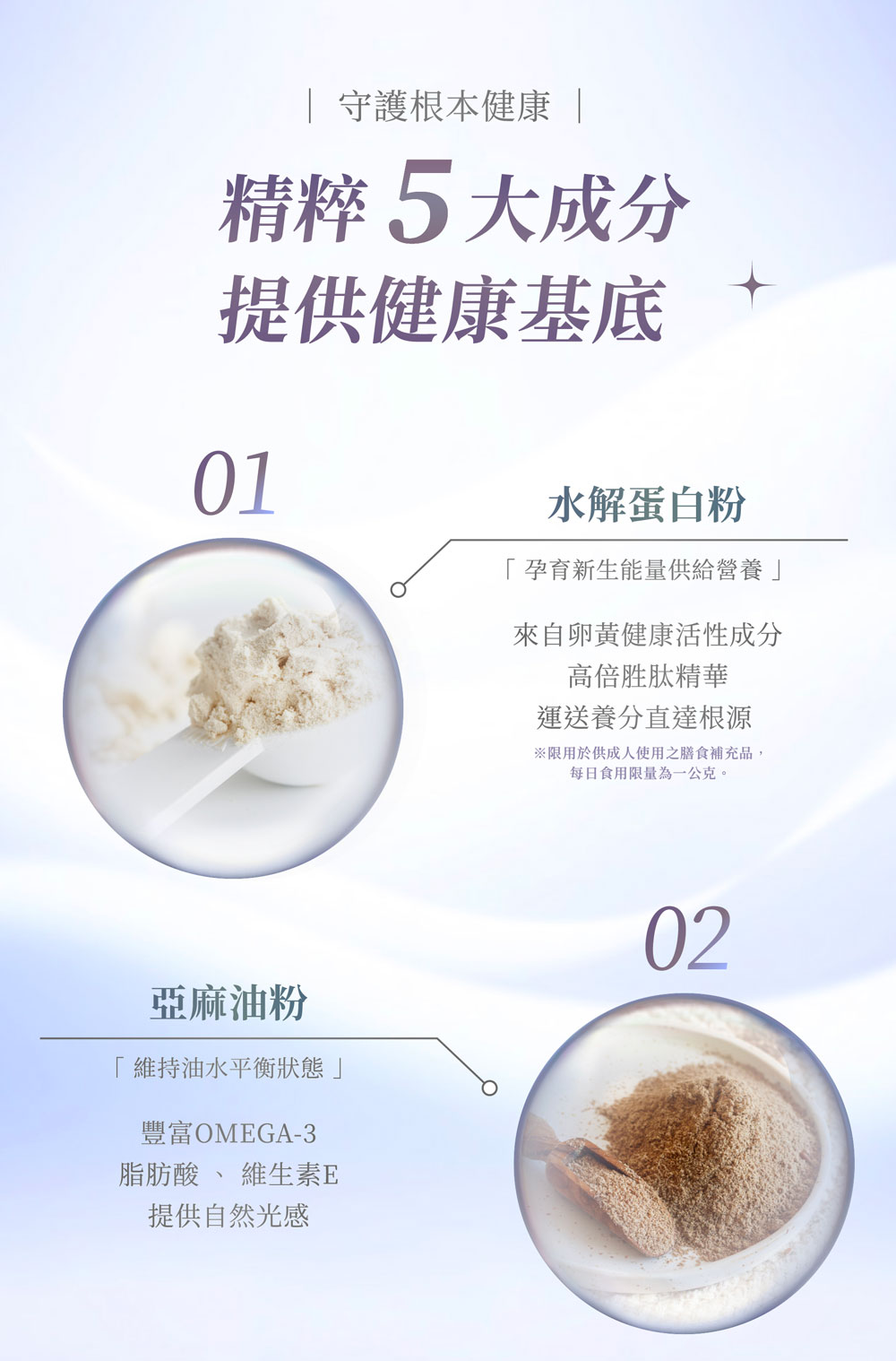 以水解蛋白粉與酵母鋅補給每日所需關鍵營養,支持髮根維持健康與活力。